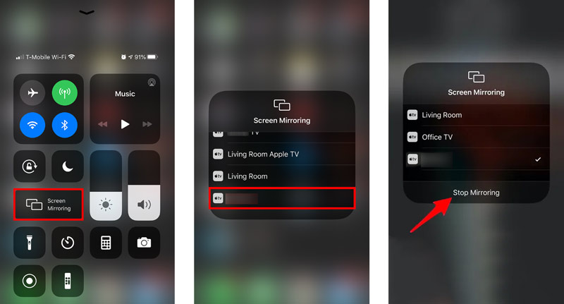 You can use similar steps to mirror your iPhone or iPad screen to a Mac through AirPlay. You can tap the Screen Mirroring icon from the Control Center, and select your Mac from the device list. After that, your iPhone/iPad content will be displayed on your Mac's screen.
