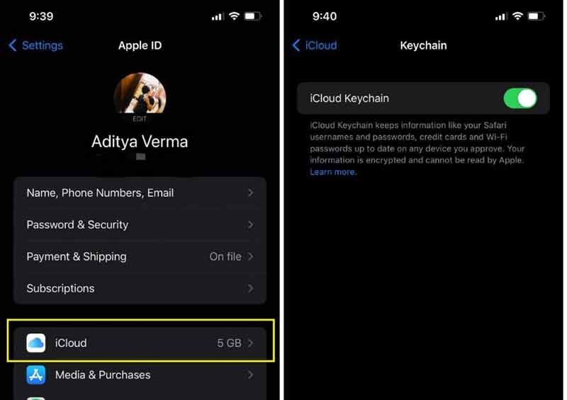 Next, run the Settings app, tap on your profile, tap iCloud, and then iCloud Keychain. When prompted, input the same Apple ID password. Then the passwords will be downloaded to the new device.