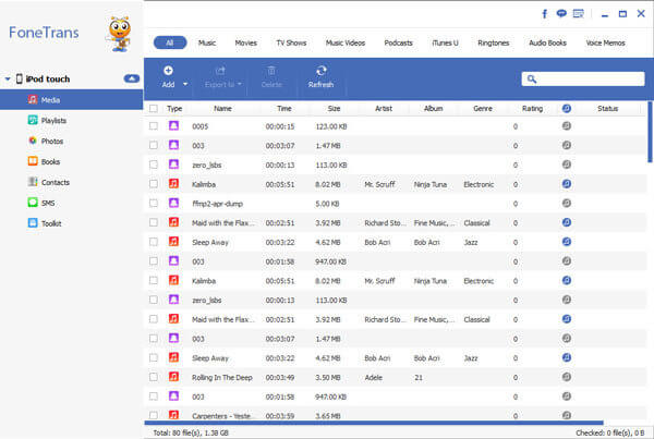 By using Aiseesoft FoneTrans, you can transfer photos between iPod and your computer with ease. FoneTrans is an ultimate iOS transfer that allows users to transfer, edit and manage most iOS files. You can output not only photos but also other file types including contacts, messages, videos, ringtones, eBooks and others. As for transferring iPod photos, you can follow steps below to put iPod photos to your Windows or Mac computer easily.