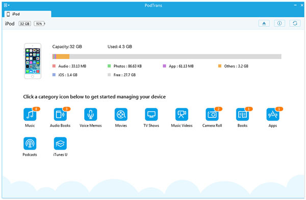 You are able to export iPod files to computer to save space, these files include music, movie, pictures, TV shows, Podcast, iTunes U, PDF, Camera Roll, voice memos, camera shot files. It also allows you to copy files from computer to iPod, like videos, songs, photos, epub, etc. What's more, you can share files between any two iOS devices including iPod, iPhone and iPod.