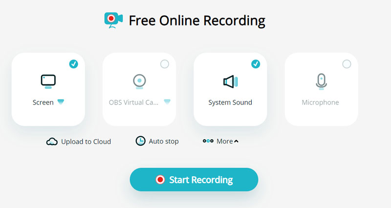Apowersoft Free Online Screen Recorder has a clear and simple interface. You can see the options and buttons in the center of the screen. Before starting, you can click and check to activate the option of the screen, webcam, system sound and microphone. This clear interface allows anyone, even a totally new user of screen recording software, to finish the operation with simple clicks.