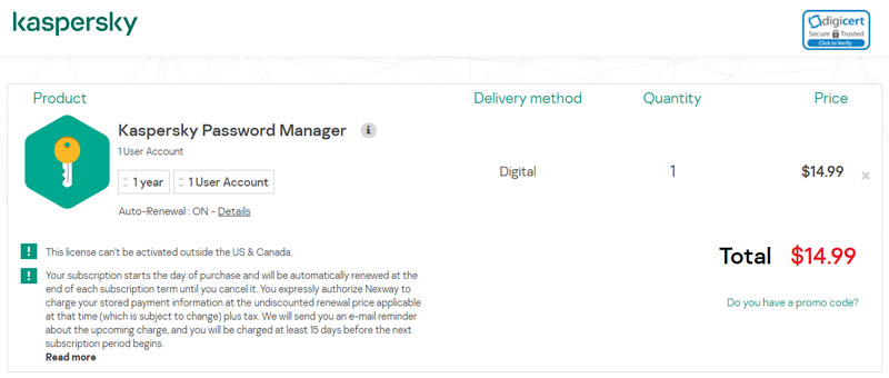 The free subscription to Kaspersky Password Manager offers 15 entries. You can upgrade to its Premium for $14.99/1 Year. For iOS and Android users, you can purchase the Premium subscription in the mobile app.