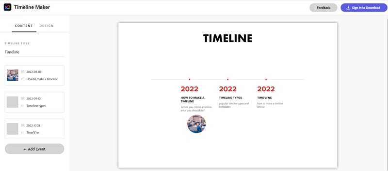 When you get to the Adobe Express Online timeline maker page, you can click on the Create a timeline now button to raise its timeline maker. Under the Content tab, you can enter the timeline title and add new events. You can select a suitable timeline template under the Design tab. This online timeline maker offers some basic tools for you to create a timeline. After you make a timeline, you need to sign in to an account to download it. Adobe Express also gives mobile apps for you to create timelines on your iPhone, iPad, and Android phone.